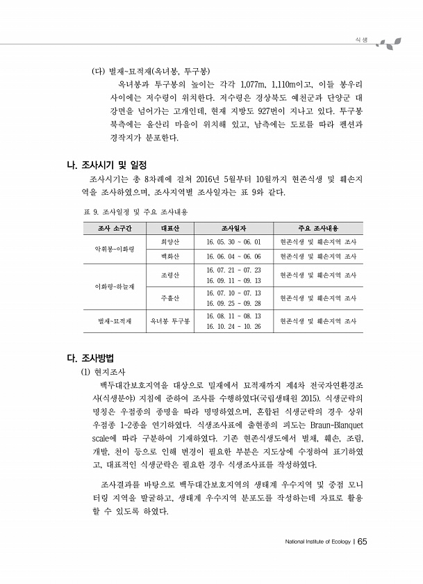 식 생 National Institute of EcologyⅠ65 다 벌재묘적재 옥녀봉, 투구봉 옥녀봉과 투구봉의 높이는 각각 1,077m, 1,110m이고, 이들 봉우리 사이에는 저수령이 위치한다. 저수령은 경상북도 예천군과 단양군 대 강면을 넘어가는 고개인데, 현재 지방도 927번이 지나고 있다. 투구봉 북측에는 올산리 마을이 위치해 있고, 남측에는 도로를 따라 펜션과 경작지가 분포한다. 나. 조사시기 및 일정 조사시기는 총 8차례에 걸쳐 2016년 5월부터 10월까지 현존식생 및 훼손지 역을 조사하였으며, 조사지역별 조사일자는 표 9와 같다. 조사 소구간 대표산 조사일자 주요 조사내용 악휘봉이화령 희양산 16. 05. 30 06. 01 현존식생 및 훼손지역 조사 백화산 16. 06. 04 06. 06 ...