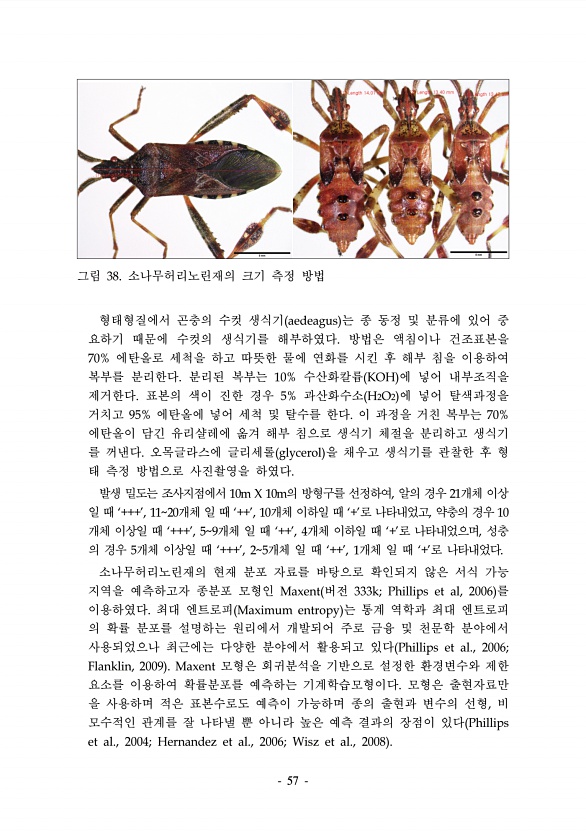 57 그림 38. 소나무허리노린재의 크기 측정 방법 형태형질에서 곤충의 수컷 생식기 aedeagus 는 종 동정 및 분류에 있어 중 요하기 때문에 수컷의 생식기를 해부하였다. 방법은 액침이나 건조표본을 70% 에탄올로 세척을 하고 따뜻한 물에 연화를 시킨 후 해부 침을 이용하여 복부를 분리한다. 분리된 복부는 10% 수산화칼륨 KOH 에 넣어 내부조직을 제거한다. 표본의 색이 진한 경우 5% 과산화수소 H2O2 에 넣어 탈색과정을 거치고 95% 에탄올에 넣어 세척 및 탈수를 한다. 이 과정을 거친 복부는 70% 에탄올이 담긴 유리샬레에 옮겨 해부 침으로 생식기 체절을 분리하고 생식기 를 꺼낸다. 오목글라스에 글리세롤 glycerol 을 채우고 생식기를 관찰한 후 형 태 측정 방법으로 사진촬영을 하였다. 발생...