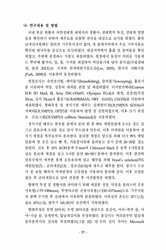 57 나. 연구내용 및 방법 국내 분포 현황과 자연생태계 내에서의 생활사, 생태학적 특성, 생태계 영향 등을 확인하기 위하여 제주도를 포함한 전국을 대상으로 조사를 하였다. 뾰족 날개선녀벌레는 알려진 기주특이성이 없어, 첫 출현지역에서 주요 기주식물로 확인된 밤나무를 중심으로 조사하였다. 대상지역에서 흡즙 및 분비물을 확인 하였고, 주변에 혼생하는 식물도 관찰하였다. 현장에서 동정이 어려운 식물체 는 뿌리째 뽑거나, 잎, 꽃, 가지를 채집하여 비닐용기에 담아 분석실 국립생태 원, 본관 202호 로 가져와 원색대한식물도감 Lee, 2003 , 한국의 귀화식물 Park, 2009 을 이용하여 동정하였다. 현장조사는 육안조사법, 채어잡기 brandishing , 쓸어잡기 sweeping , 흡충기 를 이용하여 약...