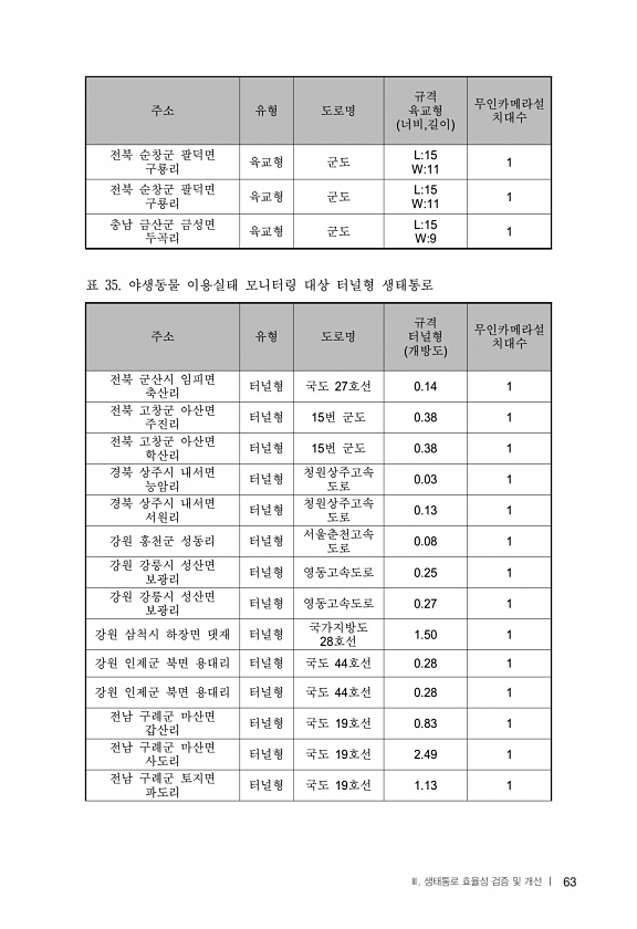 63 주소 유형 도로명 규격 육교형 너비,길이 무인카메라설 치대수 전북 순창군 팔덕면 구룡리 육교형 군도 W11 L15 1 전북 순창군 팔덕면 구룡리 육교형 군도 W11 L15 1 충남 금산군 금성면 두곡리 육교형 군도 L15 W9 1 주소 유형 도로명 규격 터널형 개방도 무인카메라설 치대수 전북 군산시 임피면 축산리 터널형 국도 27호선 0.14 1 전북 고창군 아산면 주진리 터널형 15번 군도 0.38 1 전북 고창군 아산면 학산리 터널형 15번 군도 0.38 1 경북 상주시 내서면 능암리 터널형 청원상주고속 도로 0.03 1 경북 상주시 내서면 서원리 터널형 청원상주고속 도로 0.13 1 강원 홍천군 성동리 터널형 서울춘천고속 도로 0.08 1 강원 강릉시 성산면 보광리 터널형 영동고속도로 0.25 1...