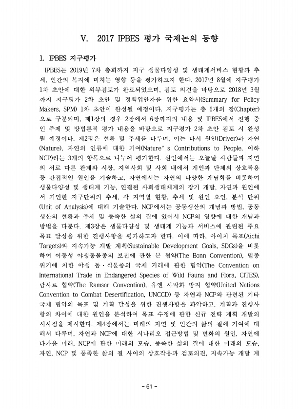 61 V. 2017 IPBES 평가 국제논의 동향 1. IPBES 지구평가 IPBES는 2019년 7차 총회까지 지구 생물다양성 및 생태계서비스 현황과 추 세, 인간의 복지에 미치는 영향 등을 평가하고자 한다. 2017년 8월에 지구평가 1차 초안에 대한 외부검토가 완료되었으며, 검토 의견을 바탕으로 2018년 3월 까지 지구평가 2차 초안 및 정책입안자를 위한 요약서 Summary for Policy Makers, SPM 1차 초안이 완성될 예정이다. 지구평가는 총 6개의 장 Chapter 으로 구분되며, 제1장의 경우 2장에서 6장까지의 내용 및 IPBES에서 진행 중 인 주제 및 방법론적 평가 내용을 바탕으로 지구평가 2차 초안 검토 시 완성 될 예정이다. 제2장은 현황 및 추세를 다루며, 이는 다시 ...