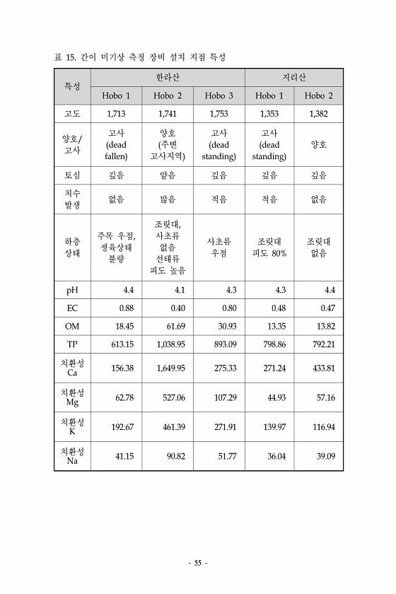 55 특성 한라산 지리산 Hobo 1 Hobo 2 Hobo 3 Hobo 1 Hobo 2 고도 1,713 1,741 1,753 1,353 1,382 양호/ 고사 고사 dead fallen 양호 주변 고사지역 고사 dead standing 고사 dead standing 양호 토심 깊음 얕음 깊음 깊음 깊음 치수 발생 없음 많음 적음 적음 없음 하층 상태 주목 우점, 생육상태 불량 조릿대, 사초류 없음 선태류 피도 높음 사초류 우점 조릿대 피도 80% 조릿대 없음 pH 4.4 4.1 4.3 4.3 4.4 EC 0.88 0.40 0.80 0.48 0.47 OM 18.45 61.69 30.93 13.35 13.82 TP 613.15 1,038.95 893.09 798.86 792.21 치환성 Ca 156.38 1,6...
