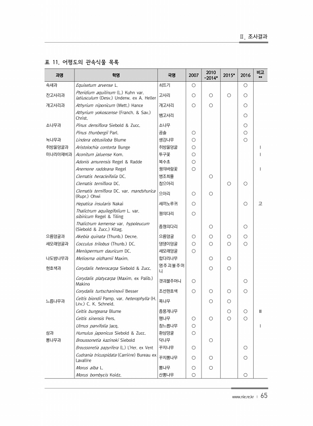 Ⅱ. 조사결과 www.nie.re.kr ? 65 과명 학명 국명 2007 2010 -2014* 2015* 2016 비고 ** 속새과 Equisetum arvense L. 쇠뜨기 ○ ○ 잔고사리과 Pteridium aquilinum L. Kuhn var. latiusculum Desv. Underw. ex A. Heller 고사리 ○ ○ ○ ○ 개고사리과 Athyrium niponicum Mett. Hance 개고사리 ○ ○ ○ Athyrium yokoscense Franch. & Sav. Christ. 뱀고사리 ○ 소나무과 Pinus densiflora Siebold & Zucc. 소나무 ○ Pinus thunbergii Parl. 곰솔 ○ ○ 녹나무과 Lindera obtusiloba Blume 생강나무 ...