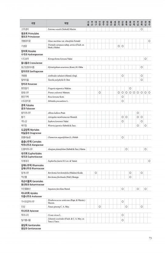 73 고추냉이 Eutrema wasabi Siebold Maxim. ○ 앵초목 Primulales 앵초과 Primulaceae 갯봄맞이꽃 Glaux maritima var. obtusifolia Fernald ○ 기생꽃 Trientalis europaea subsp. arctica Fisch. ex Hook. Hulten ○ ○ 장미목 Rosales 수국과 Hydrangeaceae 나도승마 Kirengeshoma koreana Nakai ○ 돌나물과 Crassulaceae 둥근잎꿩의비름 Hylotelephium ussuriense Kom. H. Ohba ○ 범의귀과 Saxifragaceae 개병풍 Astilboides tabularis Hemsl. Engl. ○ ○ 헐떡이풀 Tiarella polyphyll...