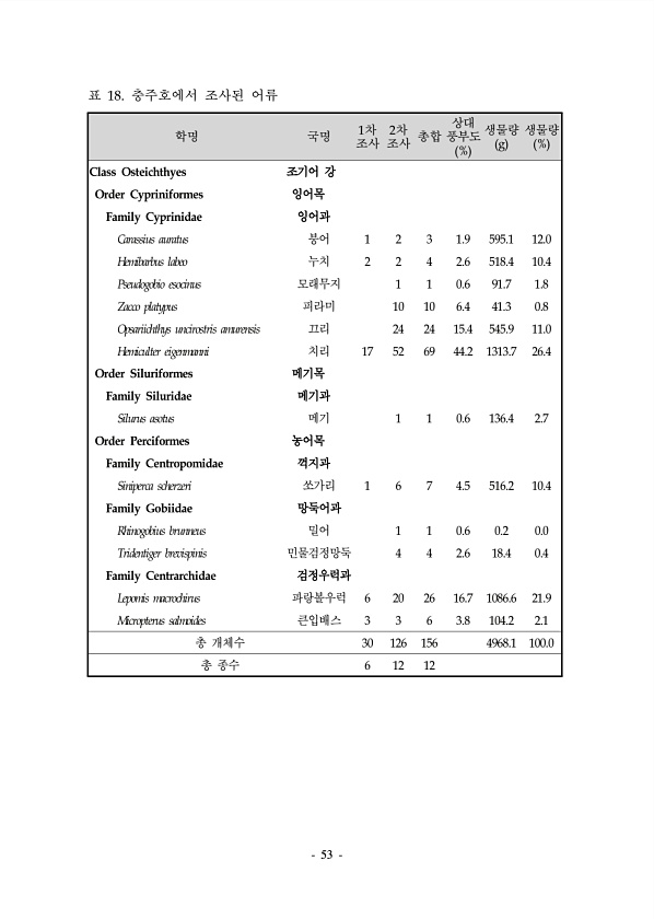 53 학명 국명 1차 조사 2차 조사 총합 상대 풍부도 % 생물량 g 생물량 % Class Osteichthyes 조기어 강 Order Cypriniformes 잉어목 Family Cyprinidae 잉어과 Carassius auratus 붕어 1 2 3 1.9 595.1 12.0 Hemibarbus labeo 누치 2 2 4 2.6 518.4 10.4 Pseudogobio esocinus 모래무지 1 1 0.6 91.7 1.8 Zacco platypus 피라미 10 10 6.4 41.3 0.8 Opsariichthys uncirostris amurensis 끄리 24 24 15.4 545.9 11.0 Hemiculter eigenmanni 치리 17 52 69 44.2 1313.7 26.4 Order Si...