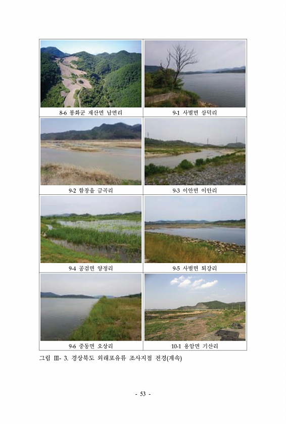 8-6 봉화군 재산면 남면리 9-1 사벌면 삼덕리 9-2 함창읍 금곡리 9-3 이안면 이안리 9-4 공검면 양정리 9-5 사벌면 퇴강리 9-6 중동면 오상리 10-1 용암면 기산리 그림 Ⅲ- 3. 경상북도 외래포유류 조사지점 전경 계속 53