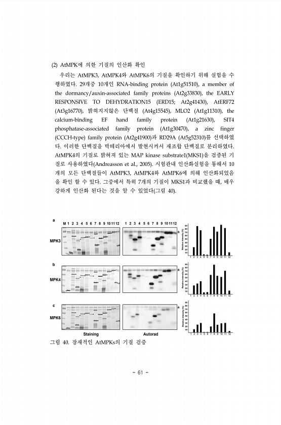 61 그림 40. 잠재적인 AtMPKs의 기질 검증 2 AtMPK에 의한 기질의 인산화 확인 우리는 AtMPK3, AtMPK4와 AtMPK6의 기질을 확인하기 위해 실험을 수 행하였다. 29개중 10개인 RNA-binding protein At1g51510 , a member of the dormancy/auxin-associated family proteins At2g33830 , the EARLY RESPONSIVE TO DEHYDRATION15 ERD15; At2g41430 , AtERF72 At3g16770 , 밝혀지지않은 단백질 At4g15545 , MLO2 At1g11310 , the calcium-binding EF hand family protein At1g21630 , SIT4 phospha...