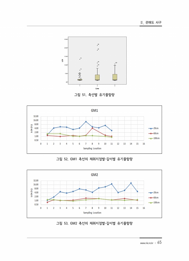 Ⅱ. 관매도 사구 www.nie.re.kr ? 65 그림 51. 측선별 유기물함량 그림 52. GM1 측선의 채취지점별-깊이별 유기물함량 그림 53. GM2 측선의 채취지점별-깊이별유기물함량
