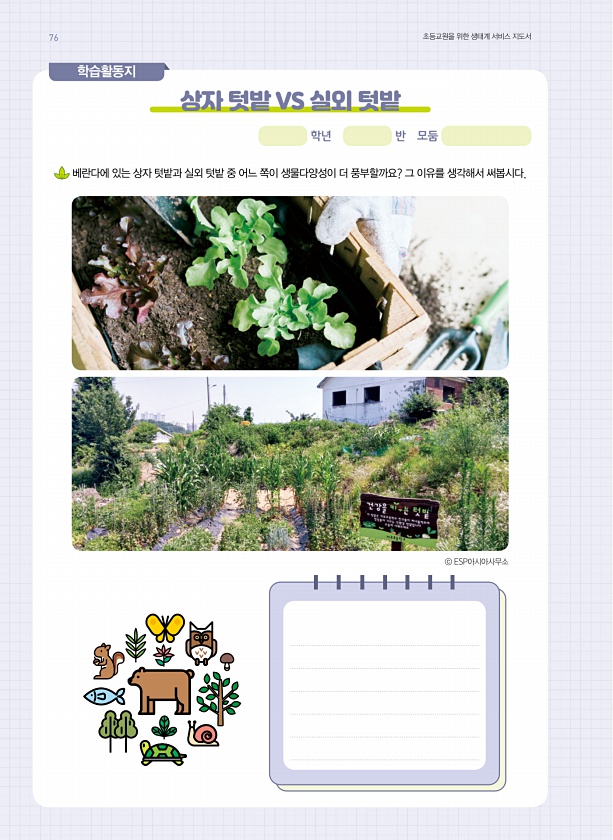 학습활동지 상자 텃밭 vs 실외 텃밭 학년 반 모둠 베란다에 있는 상자 텃밭과 실외 텃밭 중 어느 쪽이 생물다양성이 더 풍부할까요? 그 이유를 생각해서 써봅시다. ⓒ ESP아시아사무소 76 초등교원을 위한 생태계 서비스지도서