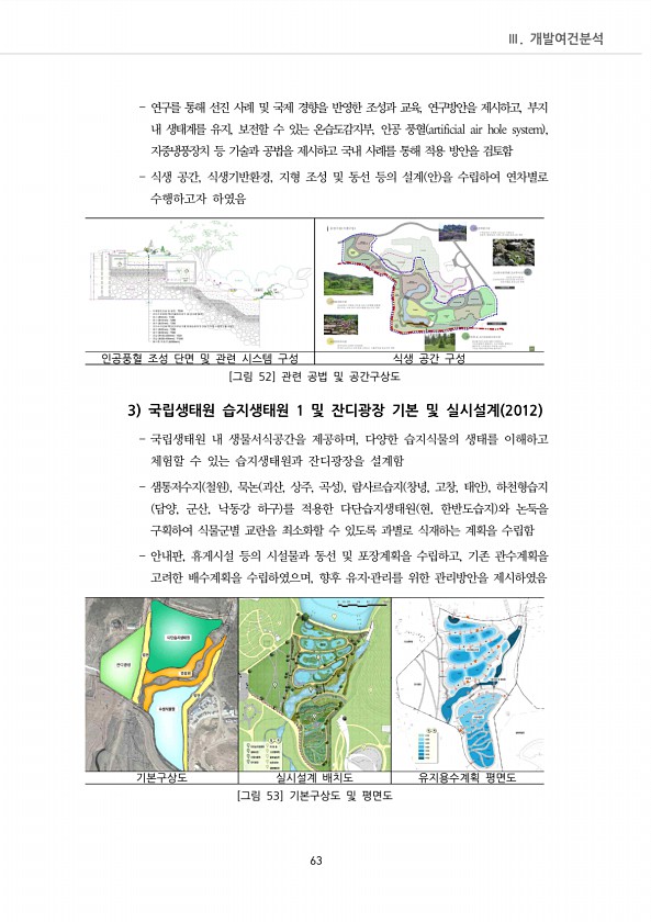Ⅲ. 개발여건분석 63 연구를 통해 선진 사례 및 국제 경향을 반영한 조성과 교육, 연구방안을 제시하고, 부지 내 생태계를 유지, 보전할 수 있는 온습도감지부, 인공 풍혈 artificial air hole system , 지중냉풍장치 등 기술과 공법을 제시하고 국내 사례를 통해 적용 방안을 검토함 식생 공간, 식생기반환경, 지형 조성 및 동선 등의 설계 안 을 수립하여 연차별로 수행하고자 하였음 인공풍혈 조성 단면 및 관련 시스템 구성 식생 공간 구성 [그림 52] 관련 공법 및 공간구상도 3 국립생태원 습지생태원 1 및 잔디광장 기본 및 실시설계 2012 국립생태원 내 생물서식공간을 제공하며, 다양한 습지식물의 생태를 이해하고 체험할 수 있는 습지생태원과 잔디광장을 설계함 샘통저수지 철원 , 묵논 괴산,...