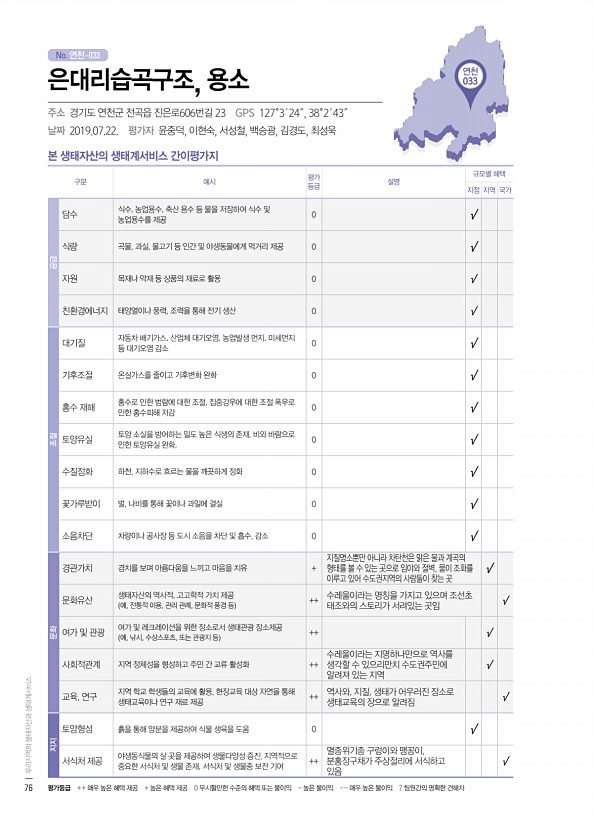 No. 연천- 연천 033 본 생태자산의 생태계서비스 간이평가지 구분 예시 평가 등급 설명 규모별 혜택 지점 지역 국가 공급 담수 식수, 농업용수, 축산 용수 등 물을 저장하여 식수 및 농업용수를 제공 0 √ 식량 곡물, 과실, 물고기 등 인간 및 야생동물에게 먹거리 제공 0 √ 자원 목재나 약재 등 상품의 재료로 활용 0 √ 친환경에너지 태양열이나 풍력, 조력을 통해 전기 생산 0 √ 조절 대기질 자동차 배기가스, 산업체 대기오염, 농업발생 먼지, 미세먼지 등 대기오염 감소 0 √ 기후조절 온실가스를 줄이고 기후변화 완화 0 √ 홍수 재해 홍수로 인한 범람에 대한 조절, 집중강우에 대한 조절 폭우로 인한 홍수피해 저감 0 √ 토양유실 토양 소실을 방어하는 밀도 높은 식생의 존재, 비와 바람으로 인한 토양유...