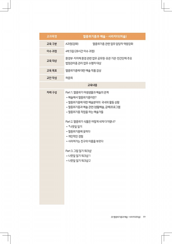 20 멸종위기종과 예술 ? 사라지다 미술 77 교과목명 멸종위기종과 예술 사라지다 미술 교육 구분 A과정 강화 멸종위기종 관련 업무 담당자 역량강화 이수 과정 4박 5일 28시간 이수 과정 교육 대상 환경부·지자체 환경 관련 업무 공무원·유관 기관·민간단체 주요 법정관리종 관리 업무 수행자 대상 교육 목표 멸종위기종에 대한 예술 작품 감상 교안 작성 허윤희 교육내용 차례 구성 Part 1. 멸종위기 야생생물과 예술의 관계 ?예술에서 멸종위기종이란? ?멸종위기종에 대한 예술분야의 국내외 활동 상황 ?멸종위기종과 예술 관련 생활예술, 공예 프로그램 ?멸종위기종 작업을 하는 예술가들 Part 2. 멸종위기 식물은 어떻게 내게 다가왔나? ? 『나뭇잎 일기 ?멸종위기종에 꽂히다 ?개인적인 경험 ?사라져가는 친구의 이...