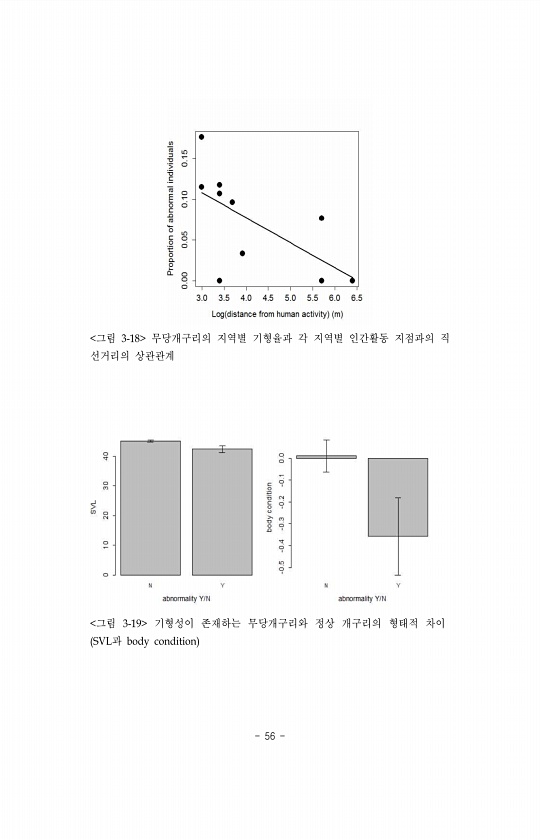 56 그림 3-18 무당개구리의 지역별 기형율과 각 지역별 인간활동 지점과의 직 선거리의 상관관계 그림 3-19 기형성이 존재하는 무당개구리와 정상 개구리의 형태적 차이 SVL과 body condition