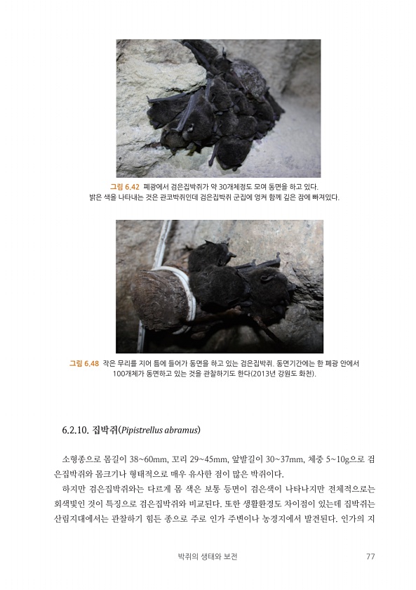 박쥐의 생태와 보전 77 그림 6.42 폐광에서 검은집박쥐가 약 30개체정도 모여 동면을 하고 있다. 밝은 색을 나타내는 것은 관코박쥐인데 검은집박쥐 군집에 엉켜 함께 깊은 잠에 빠져있다. 그림 6.48 작은 무리를 지어 틈에 들어가 동면을 하고 있는 검은집박쥐. 동면기간에는 한 폐광 안에서 100개체가 동면하고 있는 것을 관찰하기도 한다 2013년 강원도 화천 6.2.10. 집박쥐 Pipistrellus abramus 소형종으로 몸길이 3860mm, 꼬리 2945mm, 앞발길이 3037mm, 체중 510g으로 검 은집박쥐와 몸크기나 형태적으로 매우 유사한 점이 많은 박쥐이다. 하지만 검은집박쥐와는 다르게 몸 색은 보통 등면이 검은색이 나타나지만 전체적으로는 회색빛인 것이 특징으로 검은집박쥐와 비교된다. 또...