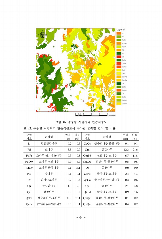 64 그림 46. 추풍령 시범지역 현존식생도 군락 기호 군락명 면적 ㎢ 비율 % 군락 기호 군락명 면적 ㎢ 비율 % Ll 일본잎갈나무 0.2 0.3 QaQs 상수리나무-졸참나무 0.1 0.1 Pd 소나무 5.5 9.7 Qm 신갈나무 12.3 21.6 PdPr 소나무-리기다소나무 0.3 0.5 QmPd 신갈나무-소나무 6.7 11.8 PdQm 소나무-신갈나무 3.9 6.9 QmQv 신갈나무-굴참나무 0.5 0.8 PdQv 소나무-굴참나무 9.1 16.1 Qs 졸참나무 0.0 0.0 Pik 잣나무 0.1 0.1 QsPd 졸참나무-소나무 2.4 4.3 Pr 리기다소나무 0.2 0.4 QsQa 졸참나무-상수리나무 0.3 0.6 Qa 상수리나무 1.3 2.3 Qv 굴참나무 2.1 3.8 Qal 갈참나무 0.0 0.0...