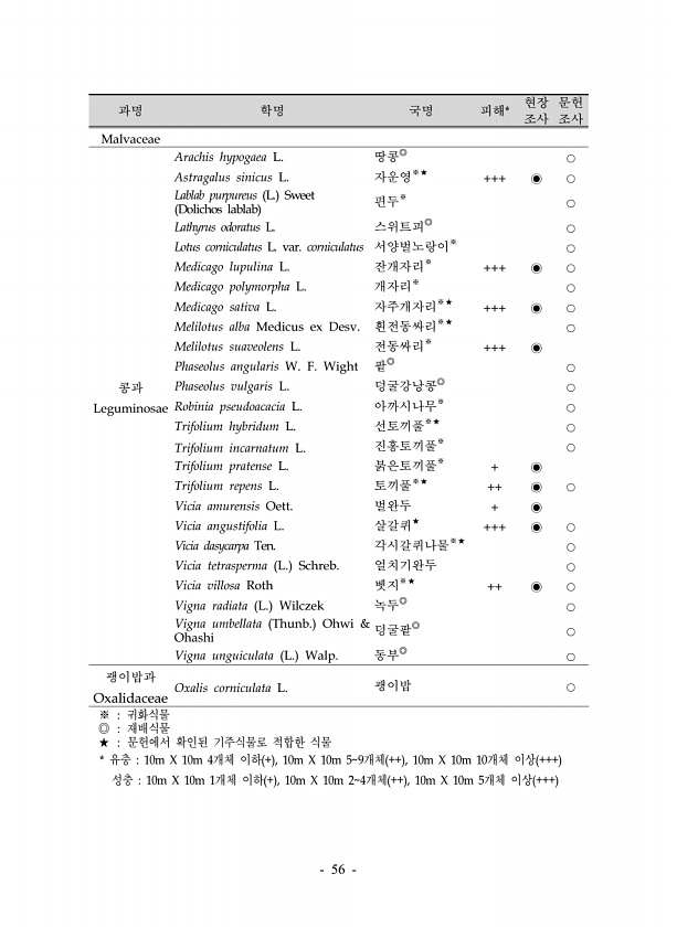 56 과명 학명 국명 피해* 현장 조사 문헌 조사 Malvaceae 콩과 Leguminosae Arachis hypogaea L. 땅콩◎ ○ Astragalus sinicus L. 자운영※★ +++ ? ○ Lablab purpureus L. Sweet Dolichos lablab 편두※ ○ Lathyrus odoratus L. 스위트피◎ ○ Lotus corniculatus L. var. corniculatus 서양벌노랑이※ ○ Medicago lupulina L. 잔개자리※ +++ ? ○ Medicago polymorpha L. 개자리※ ○ Medicago sativa L. 자주개자리※★ +++ ? ○ Melilotus alba Medicus ex Desv. 흰전동싸리※★ ○ Melilotus suaveo...