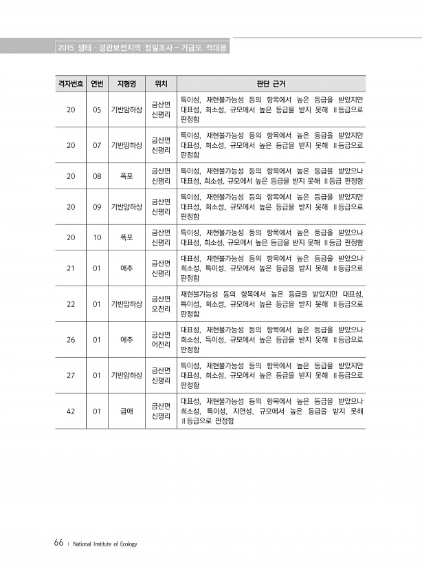 2015 생태·경관보전지역 정밀조사 거금도 적대봉 66 ? National Institute of Ecology 격자번호 연번 지형명 위치 판단 근거 20 05 기반암하상 금산면 신평리 특이성, 재현불가능성 등의 항목에서 높은 등급을 받았지만 대표성, 희소성, 규모에서 높은 등급을 받지 못해 Ⅱ등급으로 판정함 20 07 기반암하상 금산면 신평리 특이성, 재현불가능성 등의 항목에서 높은 등급을 받았지만 대표성, 희소성, 규모에서 높은 등급을 받지 못해 Ⅱ등급으로 판정함 20 08 폭포 금산면 신평리 특이성, 재현불가능성 등의 항목에서 높은 등급을 받았으나 대표성, 희소성, 규모에서 높은 등급을 받지 못해 Ⅱ등급 판정함 20 09 기반암하상 금산면 신평리 특이성, 재현불가능성 등의 항목에서 높은 등급을 받았지만...