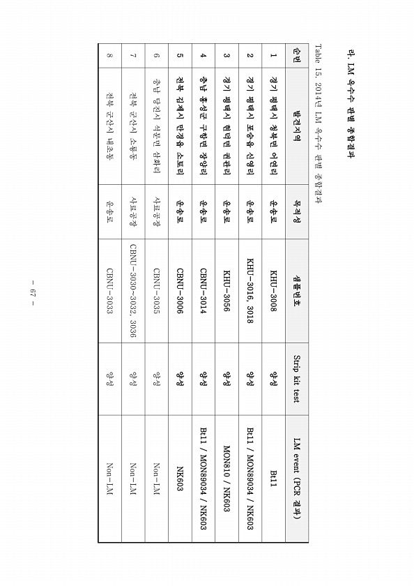 67 라. LM 옥수수 판별 종합결과 순번 발견지역 목적성 샘플번호 Strip kit test LM event PCR 결과 1 경기 평택시 청북면 어연리 운송로 KHU-3008 양성 Bt11 2 경기 평택시 포승읍 신영리 운송로 KHU-3016, 3018 양성 Bt11 MON89034 NK603 3 경기 평택시 현덕면 권관리 운송로 KHU-3056 양성 MON810 NK603 4 충남 홍성군 구항면 장양리 운송로 CBNU-3014 양성 Bt11 MON89034 NK603 5 전북 김제시 만경읍 소토리 운송로 CBNU-3006 양성 NK603 6 충남 당진시 석문면 삼화리 사료공장 CBNU-3035 양성 Non-LM 7 전북 군산시 소룡동 사료공장 CBNU-30303032, 3036 양성 Non-LM 8 전북...