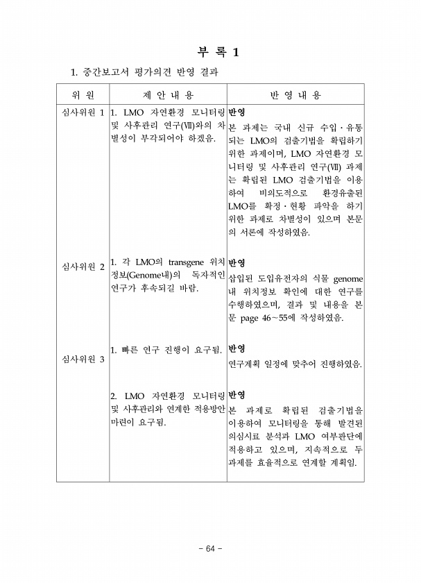 위 원 제 안 내 용 반 영 내 용 심사위원 1 심사위원 2 심사위원 3 1. LMO 자연환경 모니터링 및 사후관리 연구 Ⅶ 와의 차 별성이 부각되어야 하겠음. 1. 각 LMO의 transgene 위치 정보 Genome내 의 독자적인 연구가 후속되길 바람. 1. 빠른 연구 진행이 요구됨. 2. LMO 자연환경 모니터링 및 사후관리와 연계한 적용방안 마련이 요구됨. 반영 본 과제는 국내 신규 수입?유통 되는 LMO의 검출기법을 확립하기 위한 과제이며, LMO 자연환경 모 니터링 및 사후관리 연구 Ⅶ 과제 는 확립된 LMO 검출기법을 이용 하여 비의도적으로 환경유출된 LMO를 확정?현황 파악을 하기 위한 과제로 차별성이 있으며 본문 의 서론에 작성하였음. 반영 삽입된 도입유전자의 식물 genome 내 위치정보 ...