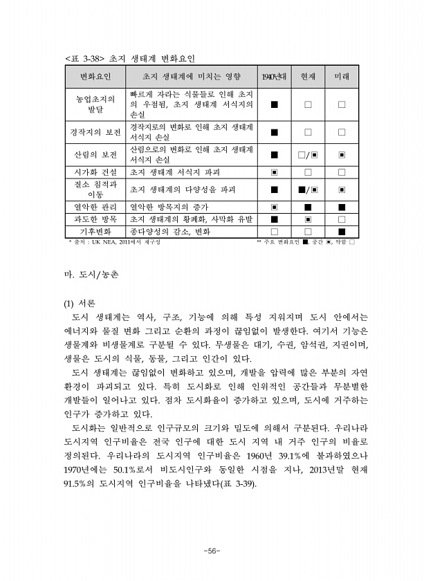 -56- 변화요인 초지 생태계에 미치는 영향 년대 현재 미래 농업초지의 발달 빠르게 자라는 식물들로 인해 초지 의 우점됨 초지 생태계 서식지의 손실 경작지의 보전 경작지로의 변화로 인해 초지 생태계 서식지 손실 산림의 보전 산림으로의 변화로 인해 초지 생태계 서식지 손실 시가화 건설 초지 생태계 서식지 파괴 질소 침적과 이동 초지 생태계의 다양성을 파괴 열악한 관리 열악한 방목지의 증가 과도한 방목 초지 생태계의 황폐화 사막화 유발 기후변화 종다양성의 감소 변화 출처 에서 재구성 주요 변화요인 중간 약함 표 초지 생태계 변화요인 마 도시 농촌 서론 도시 생태계는 역사 구조 기능에 의해 특성 지워지며 도시 안에서는 에너지와 물질 변화 그리고 순환의 과정이 끊임없이 발생한다 여기서 기능은 생물계와 비생물계로 구...