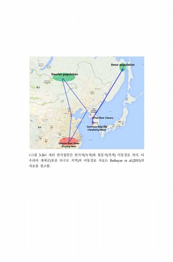 그림 3-26 개리 번식집단간 번식지 녹색 와 월동지 적색 이동경로 차이. 다 우리아 개체군 몽골 다구르 지역 의 이동경로 자료는 Batbayar et al. 2011 의 자료를참고함.