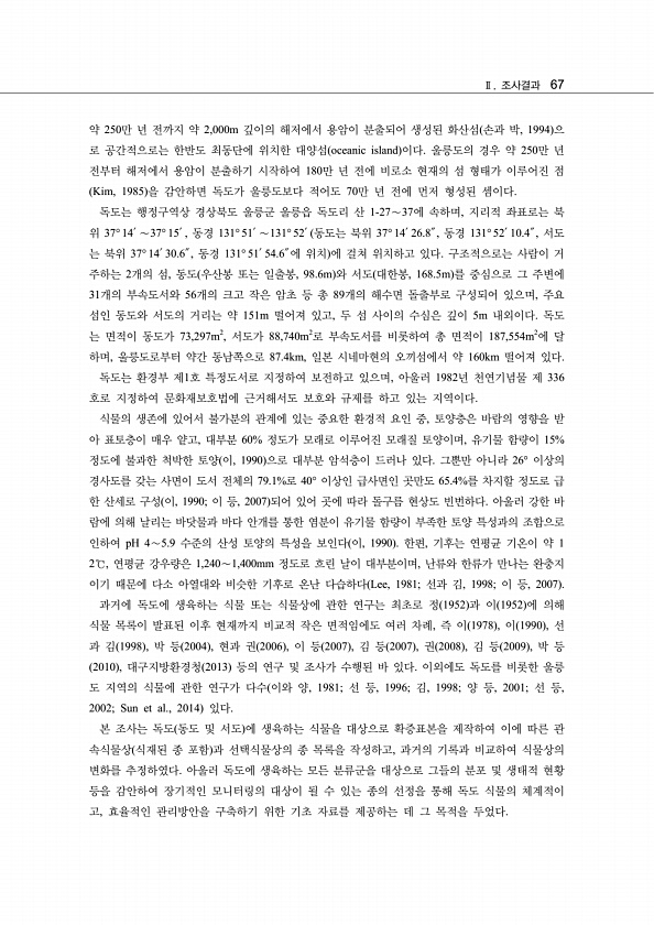 Ⅱ. 조사결과 67 약 250만 년 전까지 약 2,000m 깊이의 해저에서 용암이 분출되어 생성된 화산섬 손과 박, 1994 으 로 공간적으로는 한반도 최동단에 위치한 대양섬 oceanic island 이다. 울릉도의 경우 약 250만 년 전부터 해저에서 용암이 분출하기 시작하여 180만 년 전에 비로소 현재의 섬 형태가 이루어진 점 Kim, 1985 을 감안하면 독도가 울릉도보다 적어도 70만 년 전에 먼저 형성된 셈이다. 독도는 행정구역상 경상북도 울릉군 울릉읍 독도리 산 1-27∼37에 속하며, 지리적 좌표로는 북 위 37° 14′∼37° 15′ , 동경 131° 51′∼131° 52′ 동도는 북위 37° 14′ 26.8″, 동경 131° 52′ 10.4″, 서도 는 북위 37° 14′ 30.6″, 동...