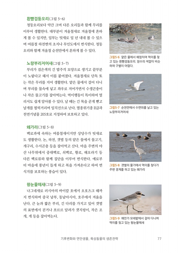 기후변화와 연안생물, 육상동물의 생존전략 77 흰뺨검둥오리 그림 5-6 청둥오리보다 약간 크며 다른 오리들과 함께 무리를 이루어 생활한다. 대부분이 겨울철새로 겨울철에 흔하 게 볼 수 있지만, 일부는 텃새로 일 년 내내 볼 수 있으 며 여름철 하천변의 초지나 무인도에서 번식한다. 청둥 오리와 함께 겨울철 순천만에서 흔하게 볼 수 있다. 노랑부리저어새 그림 5-7 부리가 검은색의 긴 밥주걱 모양으로 생기고 끝부분 이 노랗다고 해서 이름 붙여졌다. 겨울철새로 단독 또 는 작은 무리를 지어 생활한다. 얕은 물에서 걸어 다니 며 부리를 물속에 넣고 좌우로 저어가면서 수생곤충이 나 작은 물고기를 잡아먹는다. 먹이행동이 특이하여 멀 리서도 쉽게 알아볼 수 있다. 날 때는 긴 목을 곧게 뻗고 날개를 펄럭거리며 일직선으로...