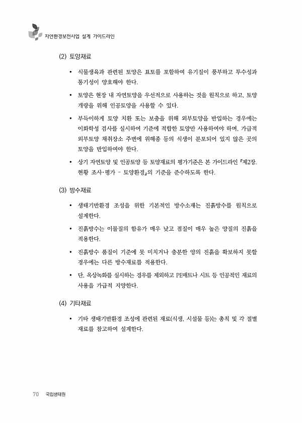 70 국립생태원 자연환경보전사업 설계 가이드라인 2 토양재료 식물생육과 관련된 토양은 표토를 포함하여 유기질이 풍부하고 투수성과 통기성이 양호해야 한다. 토양은 현장 내 자연토양을 우선적으로 사용하는 것을 원칙으로 하고, 토양 개량을 위해 인공토양을 사용할 수 있다. 부득이하게 토양 치환 또는 보충을 위해 외부토양을 반입하는 경우에는 이화학성 검사를 실시하여 기준에 적합한 토양만 사용하여야 하며, 가급적 외부토양 채취장소 주변에 위해종 등의 식생이 분포되어 있지 않은 곳의 토양을 반입하여야 한다. 상기 자연토양 및 인공토양 등 토양재료의 평가기준은 본 가이드라인 『제2장. 현황 조사?평가 ? 토양환경』의 기준을 준수하도록 한다. 3 방수재료 생태기반환경 조성을 위한 기본적인 방수소재는 진흙방수를 원칙으로 설...
