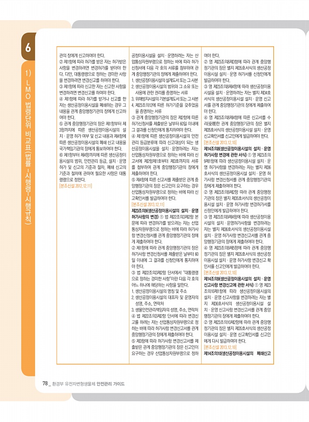 6 78 _ 환경부 유전자변형생물체 안전관리 가이드 1 L M O 법령단위 비교표 법률- 시행령- 시행규칙 관의 장에게 신고하여야 한다. ② 제1항에 따라 허가를 받은 자는 허가받은 사항을 변경하려면 변경허가를 받아야 한 다. 다만, 대통령령으로 정하는 경미한 사항 을 변경하려면 변경신고를 하여야 한다. ③ 제1항에 따라 신고한 자는 신고한 사항을 변경하려면 변경신고를 하여야 한다. ④ 제1항에 따라 허가를 받거나 신고를 한 자는 생산공정이용시설을 폐쇄하는 경우 그 내용을 관계 중앙행정기관의 장에게 신고하 여야 한다. ⑤ 관계 중앙행정기관의 장은 제1항부터 제 3항까지에 따른 생산공정이용시설의 설 치ㆍ운영 허가 여부 및 신고 내용과 제4항에 따른 생산공정이용시설의 폐쇄 신고 내용을 국가책임기관의 장에게 통보...