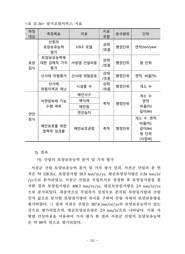 56 측정 대상 측정목표 지표 지표 유형 분석범위 단위 토양 침식 산림의 토양보유능력 평가 USLE 모델 상태 /흐름 행정단위 면적/ton/year 토양보유능력에 대한 경제적 가치 평가 사방댐 건설비용 상태 /흐름 행정단위 원 단위 산사태 위험평가 산사태 위험분포 상태 /흐름 행정단위 면적, 비율 % 산사태 위험지역과 재난 시설물 수 /상태 흐름 행정단위 개소 수 연안 침식 자연방파제 기능 수행 여부 해안사구 축적 행정단위 개소 수 면적 비율 % 길이 ㎞ 해식애 해안림 연안습지 해안보호를 위한 정책적 성과물 해안보호공법 축적 행정단위 개소 수 ,면적 비율 % , 길이 ㎞ 원 단위 사업비 표 침식조절서비스 지표 결과 가 산림의 토양보유능력 분석 및 가치 평가 서천군 산림 토양보유능력 분석 및 가치 평가 결과 ...