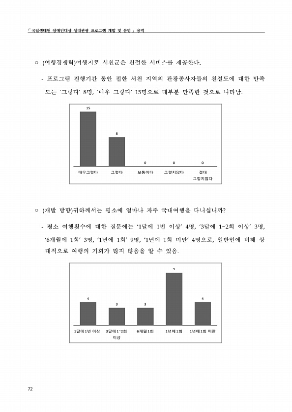 ?국립생태원 장애인대상 생태관광 프로그램 개발 및 운영? 용역 72 ? 여행경쟁력 여행지로 서천군은 친절한 서비스를 제공한다. 프로그램 진행기간 동안 접한 서천 지역의 관광종사자들의 친절도에 대한 만족 도는 ‘그렇다’ 8명, ‘매우 그렇다’ 15명으로 대부분 만족한 것으로 나타남. 15 8 0 0 0 매우그렇다 그렇다 보통이다 그렇지않다 절대 그렇지않다 ? 개발 방향 귀하께서는 평소에 얼마나 자주 국내여행을 다니십니까? 평소 여행횟수에 대한 질문에는 ‘1달에 1번 이상’ 4명, ‘3달에 12회 이상’ 3명, ‘6개월에 1회’ 3명, ‘1년에 1회’ 9명, ‘1년에 1회 미만’ 4명으로, 일반인에 비해 상 대적으로 여행의 기회가 많지 않음을 알 수 있음. 4 3 3 9 4 1달에 1번 이상 3달에 12회 이상...