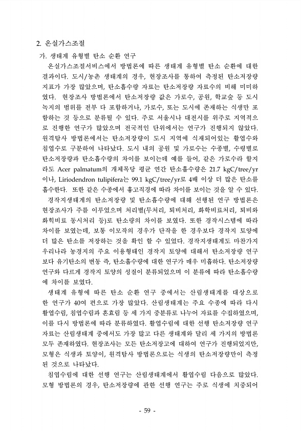 온실가스조절 가 생태계 유형별 탄소 순환 연구 온실가스조절서비스에서 방법론에 따른 생태계 유형별 탄소 순환에 대한 결과이다 도시 농촌 생태계의 경우 현장조사를 통하여 측정된 탄소저장량 지표가 가장 많았으며 탄소흡수량 자료는 탄소저장량 자료수의 비해 미미하 였다 현장조사 방법론에서 탄소저장량 값은 가로수 공원 학교숲 등 도시 녹지의 범위를 전부 다 포함하거나 가로수 또는 도시에 존재하는 식생만 포 함하는 것 등으로 분류될 수 있다 주로 서울시나 대전시를 위주로 지역적으 로 진행한 연구가 많았으며 전국적인 단위에서는 연구가 진행되지 않았다 원격탐사 방법론에서는 탄소저장량이 도시 지역에 식재되어있는 활엽수와 침엽수로 구분하여 나타났다 도시 내의 공원 및 가로수는 수종별 수령별로 탄소저장량과 탄소흡수량의 차이를 보...