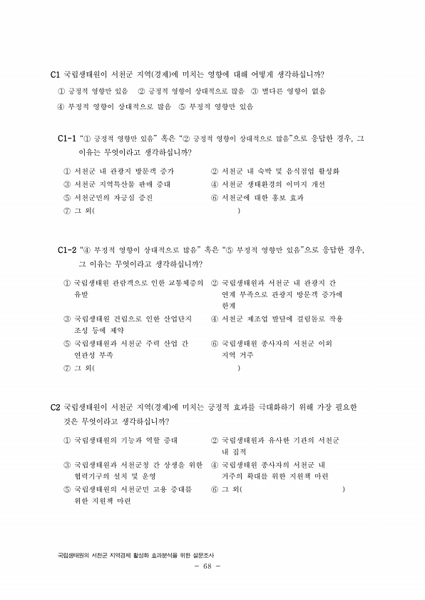 국립생태원의 서천군 지역경제 활성화 효과분석을 위한 설문조사 68 C1 국립생태원이 서천군 지역 경제 에 미치는 영향에 대해 어떻게 생각하십니까? ① 긍정적 영향만 있음 ② 긍정적 영향이 상대적으로 많음 ③ 별다른 영향이 없음 ④ 부정적 영향이 상대적으로 많음 ⑤ 부정적 영향만 있음 C1-1 “① 긍정적 영향만 있음” 혹은 “② 긍정적 영향이 상대적으로 많음”으로 응답한 경우, 그 이유는 무엇이라고 생각하십니까? ① 서천군 내 관광지 방문객 증가 ② 서천군 내 숙박 및 음식점업 활성화 ③ 서천군 지역특산물 판매 증대 ④ 서천군 생태환경의 이미지 개선 ⑤ 서천군민의 자긍심 증진 ⑥ 서천군에 대한 홍보 효과 ⑦ 그 외 C1-2 “④ 부정적 영향이 상대적으로 많음” 혹은 “⑤ 부정적 영향만 있음”으로 응답한 경우...