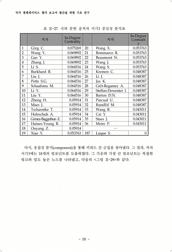 국가 생태계서비스 평가 보고서 발간을 위한 기초 연구 58 저자 Centrality In-Degree 저자 In-Degree Centralit y 1 G?rg C. 0.075269 20 Wang X. 0.053763 2 Wang Y. 0.069892 21 Bommarco R. 0.053763 3 Gao Y. 0.069892 22 Beaumont N. 0.053763 4 Zhang J. 0.069892 23 Wang J. 0.053763 5 Li S. 0.064516 24 Wang S. 0.053763 6 Burkhard B. 0.064516 25 Kremen C. 0.048387 7 Liu J. 0.064516 26 Li J. 0.048387 8 Potts S.G. 0.064516 27 Jax K. 0.04...