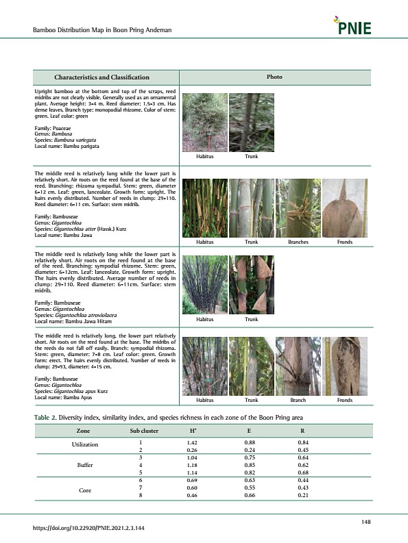 148 Bamboo Distribution Map in Boon Pring Andeman https//doi.org/10.22920/PNIE.2021.2.3.144 Characteristics and Classifcation Upright bamboo at the bottom and top of the scraps, reed midribs are not clearly visible. Generally used as an ornamental plant. Average height3-4 m. Reed diameter1.5-3 cm. Has dense leaves. Branch typemonopodial rhizome. Color of stemgreen. Leaf colorgreen FamilyPoaceae Ge...