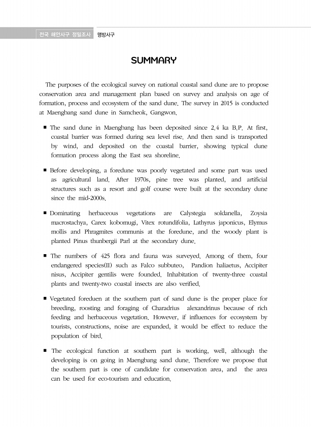 전국 해안사구 정밀조사 맹방사구 SUMMARY The purposes of the ecological survey on national coastal sand dune are to propose conservation area and management plan based on survey and analysis on age of formation, process and ecosystem of the sand dune. The survey in 2015 is conducted at Maengbang sand dune in Samcheok, Gangwon. ? The sand dune in Maengbang has been deposited since 2.4 ka B.P. At first, coastal ba...