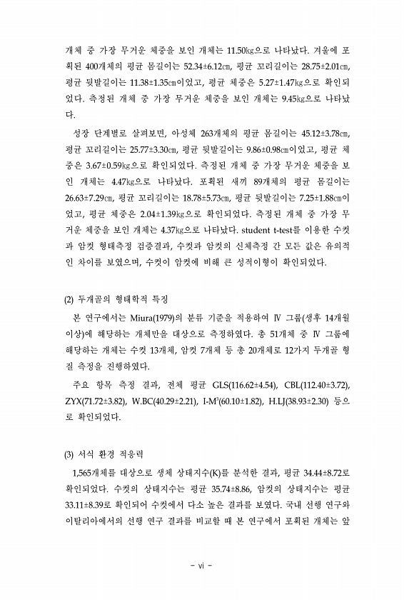개체 중 가장 무거운 체중을 보인 개체는 11.50㎏으로 나타났다. 겨울에 포 획된 400개체의 평균 몸길이는 52.34±6.12㎝, 평균 꼬리길이는 28.75±2.01㎝, 평균 뒷발길이는 11.38±1.35㎝이었고, 평균 체중은 5.27±1.47㎏으로 확인되 었다. 측정된 개체 중 가장 무거운 체중을 보인 개체는 9.45㎏으로 나타났 다. 성장 단계별로 살펴보면, 아성체 263개체의 평균 몸길이는 45.12±3.78㎝, 평균 꼬리길이는 25.77±3.30㎝, 평균 뒷발길이는 9.86±0.98㎝이었고, 평균 체 중은 3.67±0.59㎏으로 확인되었다. 측정된 개체 중 가장 무거운 체중을 보 인 개체는 4.47㎏으로 나타났다. 포획된 새끼 89개체의 평균 몸길이는 26.63±7.29㎝, 평균 꼬리길이는 18....