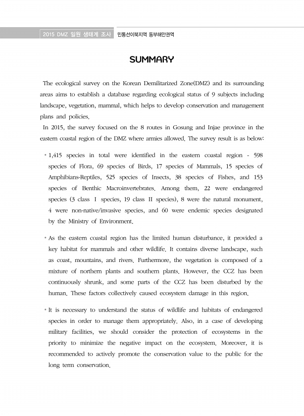 2015 DMZ 일원 생태계 조사 민통선이북지역 동부해안권역 SUMMARY The ecological survey on the Korean Demilitarized Zone DMZ and its surrounding areas aims to establish a database regarding ecological status of 9 subjects including landscape, vegetation, mammal, which helps to develop conservation and management plans and policies. In 2015, the survey focused on the 8 routes in Gosung and Injae province in the eastern co...