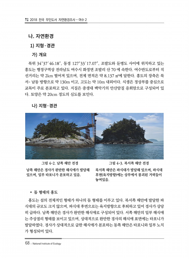 2018 전국 무인도서 자연환경조사 여수 2 68 ? National Institute of Ecology 1 · 북위 34°37′46.18″, 동경 127°33′17.07″, 조발도와 둔병도 사이에 위치하고 있는 홍도는 행정구역상 전라남도 여수시 화정면 조발리 산 70 에 속한다. 여수반도로부터 직 선거리는 약 2km 떨어져 있으며, 전제 면적은 약 8,137 ㎡에 달한다. 홍도의 장축은 북 서- 남동 방향으로 약 130m 이고, 고도는 약 10m 내외이다. 식생은 정상부를 중심으로 교목이 주로 분포하고 있다. 지질은 중생대 백악기의 안산암질 응회암으로 구성되어 있 다. 토양은 약 20cm 정도의 심도를 보인다. · 그림 4-2. 남쪽 해안 전경 남쪽 해안은 경사가 완만한 해식애가 발달해 있으며, 일부 타...