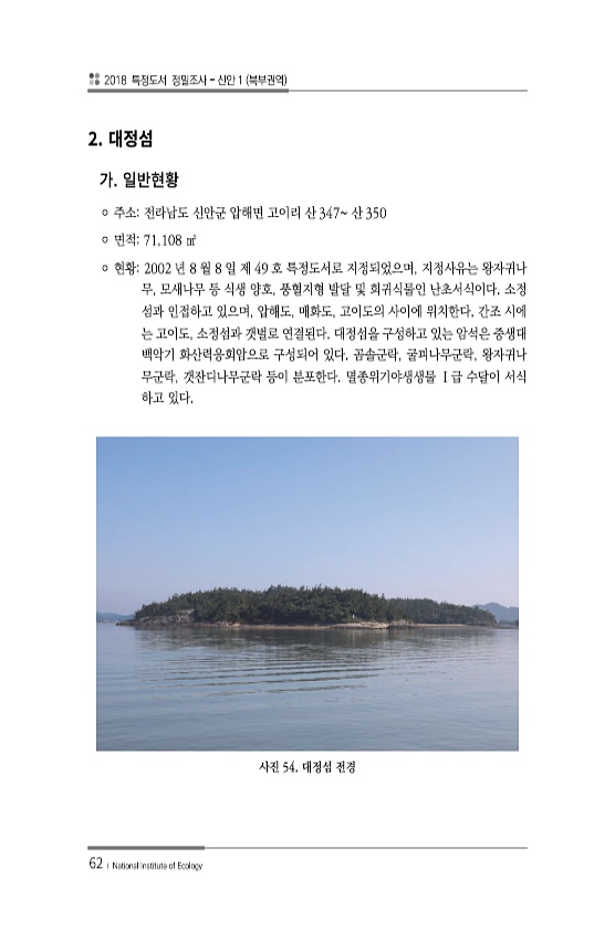 2018 특정도서 정밀조사 신안 1 북부권역 62 ? National Institute of Ecology 2. ? 주소전라남도 신안군 압해면 고이리 산 347산 350 ? 면적71,108 ㎡ ? 현황2002 년 8 월 8 일 제 49 호 특정도서로 지정되었으며, 지정사유는 왕자귀나 무, 모새나무 등 식생 양호, 풍혈지형 발달 및 희귀식물인 난초서식이다. 소정 섬과 인접하고 있으며, 압해도, 매화도, 고이도의 사이에 위치한다. 간조 시에 는 고이도, 소정섬과 갯벌로 연결된다. 대정섬을 구성하고 있는 암석은 중생대 백악기 화산력응회암으로 구성되어 있다. 곰솔군락, 굴피나무군락, 왕자귀나 무군락, 갯잔디나무군락 등이 분포한다. 멸종위기야생생물 Ⅰ급 수달이 서식 하고 있다. 사진 54. 대정섬전경