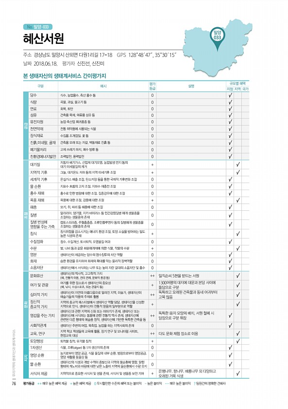 No. 밀양- 본 생태자산의 생태계서비스 간이평가지 구분 예시 평가 등급 설명 규모별 혜택 지점 지역 국가 공급 담수 식수, 농업용수, 축산 용수 등 0 √ 식량 곡물, 과실, 물고기 등 0 √ 연료 화목, 토탄 0 √ 섬유 건축용 목재, 의류용 섬유 등 0 √ 유전자원 농업·축산업 희귀품종 등 0 √ 천연약재 전통 의약품에 사용되는 식물 0 √ 장식재료 수집용 조개껍질, 꽃 등 0 √ 진흙,미네랄, 골재 건축용 모래 또는 자갈, 벽돌재료 진흙 등 0 √ 폐기물처리 고체 쓰레기 하치, 폐수 방류 등 0 √ 친환경에너지발전 조력발전, 풍력발전 0 √ 조절 대기질 자동차 배기가스, 산업체 대기오염, 농업발생 먼지 등의 대기 미세물질의 제거 + √ 지역적 기후 그늘, 대기온도 저하 등의 지역 미세기후 조절 + √...