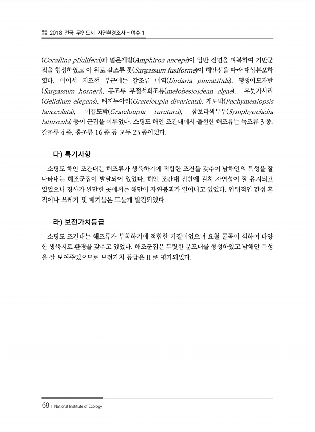 2018 전국 무인도서 자연환경조사 여수 1 68 ? National Institute of Ecology Corallina pilulifera 과 넓은게발 Amphiroa anceps 이 암반 전면을 피복하여 기반군 집을 형성하였고 이 위로 갈조류 톳 Sargassum fusiforme 이 해안선을 따라 대상분포하 였다. 이어서 저조선 부근에는 갈조류 미역 Undaria pinnatifida , 괭생이모자반 Sargassum horneri , 홍조류 무절석회조류 melobesioidean algae , 우뭇가사리 Gelidium elegans , 뼈지누아리 Grateloupia divaricata , 개도박 Pachymeniopsis lanceolata , 미끌도박 Grateloupia turuturu ,...