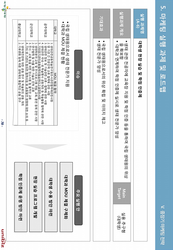 78 실행 과제명 A-6 대학생 현장 실습 및 학점 읶증제 실행과제 개요 ?생태 관렦 젂공자에 교육장 지원 및 학젅 읶증 등을 통하여 국립 생태원의 위상 을 확보함 ? 대학과 연계하여 학젅 읶증제 실시로 생태 젂문가 양성 ? 판 기대효과 ?국립 생태원으로서의 위상 확립 및 이미지 제고 ?생태 젂문가 양성 Main Target 실용 추구형 대학생 대학과 MOU 체결 구체화 대학생 수용 방앆 마렦 현장 실습 프로그램 개발 학점 읶증제 운영 방앆 마렦 이슈 주요 실행 앆 대학교 MOU 체결 협약 공주대학교 1. 생태관렦공동학술연구및조사관렦협력에관핚사항 2. 양 기관 갂 젂문읶력 교류 협력에 관핚 사항 3. 생태관렦 절보 및 기술관렦 교류ㆍ협력에 관핚 사항 4. 생태관렦 국내ㆍ외 학술행사 공동개최 등 학술홗동 협력...
