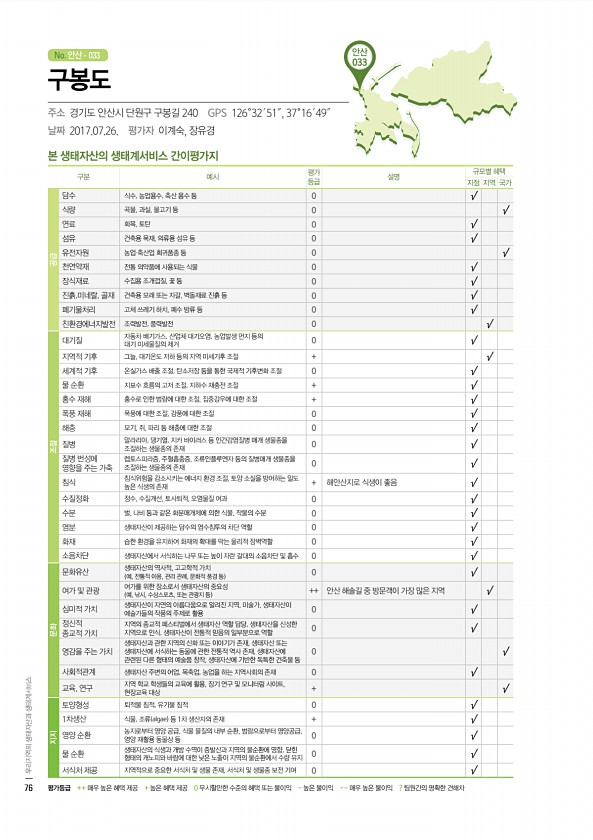 No. 안산 안산 033 본 생태자산의 생태계서비스 간이평가지 구분 예시 평가 등급 설명 규모별 혜택 지점 지역 국가 공급 담수 식수, 농업용수, 축산 용수 등 0 √ 식량 곡물, 과실, 물고기 등 0 √ 연료 화목, 토탄 0 √ 섬유 건축용 목재, 의류용 섬유 등 0 √ 유전자원 농업·축산업 희귀품종 등 0 √ 천연약재 전통 의약품에 사용되는 식물 0 √ 장식재료 수집용 조개껍질, 꽃 등 0 √ 진흙,미네랄, 골재 건축용 모래 또는 자갈, 벽돌재료 진흙 등 0 √ 폐기물처리 고체 쓰레기 하치, 폐수 방류 등 0 √ 친환경에너지발전 조력발전, 풍력발전 0 √ 조절 대기질 자동차 배기가스, 산업체 대기오염, 농업발생 먼지 등의 대기 미세물질의 제거 0 √ 지역적 기후 그늘, 대기온도 저하 등의 지역 미세기후 ...