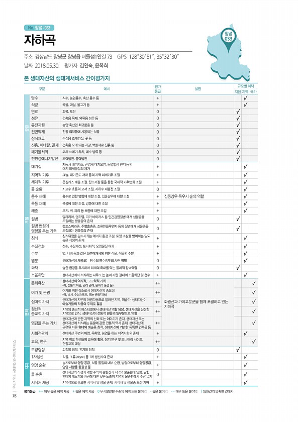 No. 창녕- 창녕 033 본 생태자산의 생태계서비스 간이평가지 구분 예시 평가 등급 설명 규모별 혜택 지점 지역 국가 공급 담수 식수, 농업용수, 축산 용수 등 + √ 식량 곡물, 과실, 물고기 등 + √ 연료 화목, 토탄 0 √ 섬유 건축용 목재, 의류용 섬유 등 0 √ 유전자원 농업·축산업 희귀품종 등 0 √ 천연약재 전통 의약품에 사용되는 식물 0 √ 장식재료 수집용 조개껍질, 꽃 등 0 √ 진흙, 미네랄, 골재 건축용 모래 또는 자갈, 벽돌재료 진흙 등 0 √ 폐기물처리 고체 쓰레기 하치, 폐수 방류 등 0 √ 친환경에너지발전 조력발전, 풍력발전 0 √ 조절 대기질 자동차 배기가스, 산업체 대기오염, 농업발생 먼지 등의 대기 미세물질의 제거 + √ 지역적 기후 그늘, 대기온도 저하 등의 지역 미세기...