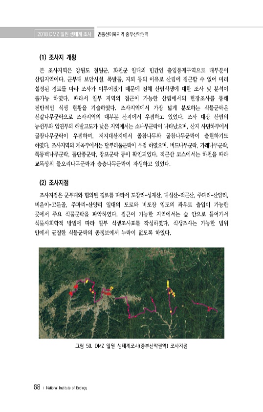 2018 DMZ 일원 생태계 조사 민통선이북지역 중부산악권역 68 ? National Institute of Ecology 1 조사지 개황 본 조사지역은 강원도 철원군, 화천군 일대의 민간인 출입통제구역으로 대부분이 산림지역이다. 군부대 보안시설, 폭발물, 지뢰 등의 이유로 산림에 접근할 수 없어 미리 설정된 경로를 따라 조사가 이루어졌기 때문에 전체 산림식생에 대한 조사 및 분석이 불가능 하였다. 따라서 일부 지역의 접근이 가능한 산림에서의 현장조사를 통해 전반적인 식생 현황을 기술하였다. 조사지역에서 가장 넓게 분포하는 식물군락은 신갈나무군락으로 조사지역의 대부분 산지에서 우점하고 있었다. 조사 대상 산림의 능선부와 임연부의 해발고도가 낮은 지역에서는 소나무군락이 나타났으며, 산지 사면하부에서 굴참나무군...