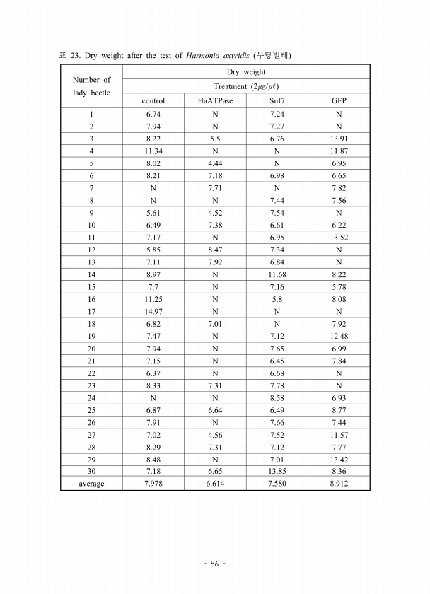 56 23. Dry weight after the test of Harmonia axyridis Number of lady beetle Dry weight Treatment 2㎍/㎕ control HaATPase Snf7 GFP 1 6.74 N 7.24 N 2 7.94 N 7.27 N 3 8.22 5.5 6.76 13.91 4 11.34 N N 11.87 5 8.02 4.44 N 6.95 6 8.21 7.18 6.98 6.65 7 N 7.71 N 7.82 8 N N 7.44 7.56 9 5.61 4.52 7.54 N 10 6.49 7.38 6.61 6.22 11 7.17 N 6.95 13.52 12 5.85 8.47 7.34 N 13 7.11 7.92 6.84 N 14 8.97 N 11.68 8.22 15 ...
