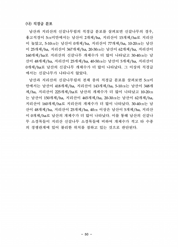 50 나 직경급 분포 남산과 지리산의 신갈나무림의 직경급 분포를 살펴보면 신갈나무의 경우, 흉고직경이 5㎝미만에서는 남산이 2개체/ha, 지리산이 15개체/ha로 지리산 이 높았고, 5-10㎝는 남산이 0개체/ha, 지리산이 77개체/ha, 10-20㎝는 남산 이 25개체/ha, 지리산이 367개체/ha, 20-30㎝는 남산이 62개체/ha, 지리산이 160개체/ha로 지리산의 신갈나무 개체수가 더 많이 나타났고 30-40㎝는 남 산이 48개체/ha, 지리산이 25개체/ha, 40-50㎝는 남산이 5개체/ha, 지리산이 0개체/ha로 남산의 신갈나무 개체수가 더 많이 나타났다. 그 이상의 직경급 에서는 신갈나무가 나타나지 않았다. 남산과 지리산의 신갈나무림의 전체 종의 직경급 분포를 살펴보면 5㎝미 만에서는...