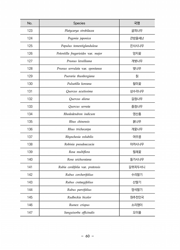 60 No. Species 국명 123 Platycarya strobilacea 굴피나무 124 Pogonia japonica 큰방울새난 125 Populus tomentiglandulosa 은사시나무 126 Potentilla fragarioides var. major 양지꽃 127 Prunus leveilleana 개벚나무 128 Prunus serrulata var. spontanea 벚나무 129 Pueraria thunbergiana 칡 130 Pulsatilla koreana 할미꽃 131 Quercus acutissima 상수리나무 132 Quercus aliena 갈참나무 133 Quercus serrata 졸참나무 134 Rhododendron indicum 영산홍 135 Rhus chine...