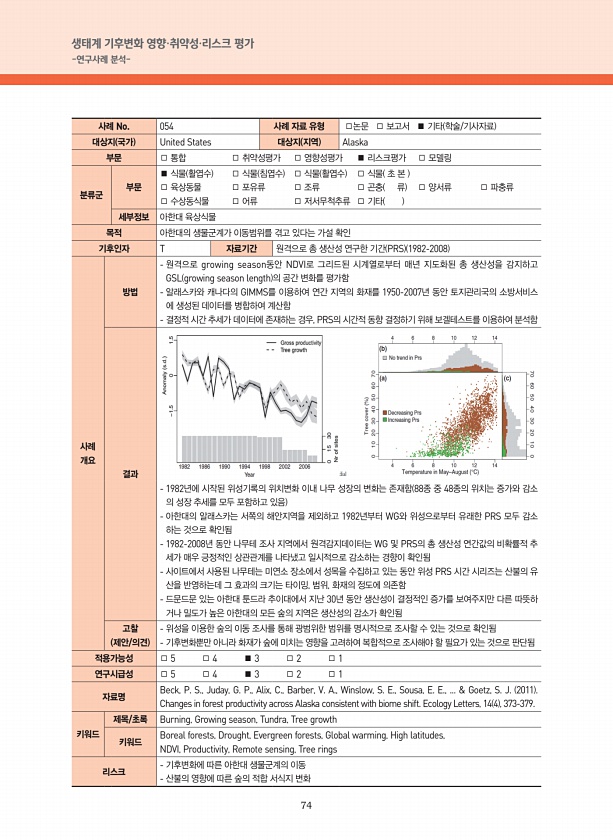 74 생태계 기후변화 영향·취약성·리스크 평가 -연구사례 분석- 사례 No. 054 사례 자료 유형 □논문 □ 보고서 ■ 기타 학술/기사자료 대상지 국가 United States 대상지 지역 Alaska 부문 □ 통합 □ 취약성평가 □ 영향성평가 ■ 리스크평가 □ 모델링 분류군 부문 ■ 식물 활엽수 □ 식물 침엽수 □ 식물 활엽수 □ 식물 초 본 □ 육상동물 □ 포유류 □ 조류 □ 곤충 류 □ 양서류 □ 파충류 □ 수상동식물 □ 어류 □ 저서무척추류 □ 기타 세부정보 아한대 육상식물 목적 아한대의 생물군계가 이동범위를 겪고 있다는 가설 확인 기후인자 T 자료기간 원격으로 총 생산성 연구한 기간 PRS 1982-2008 사례 개요 방법 원격으로 growing season동안 NDVI로 그리드된 시계열로부터 매...